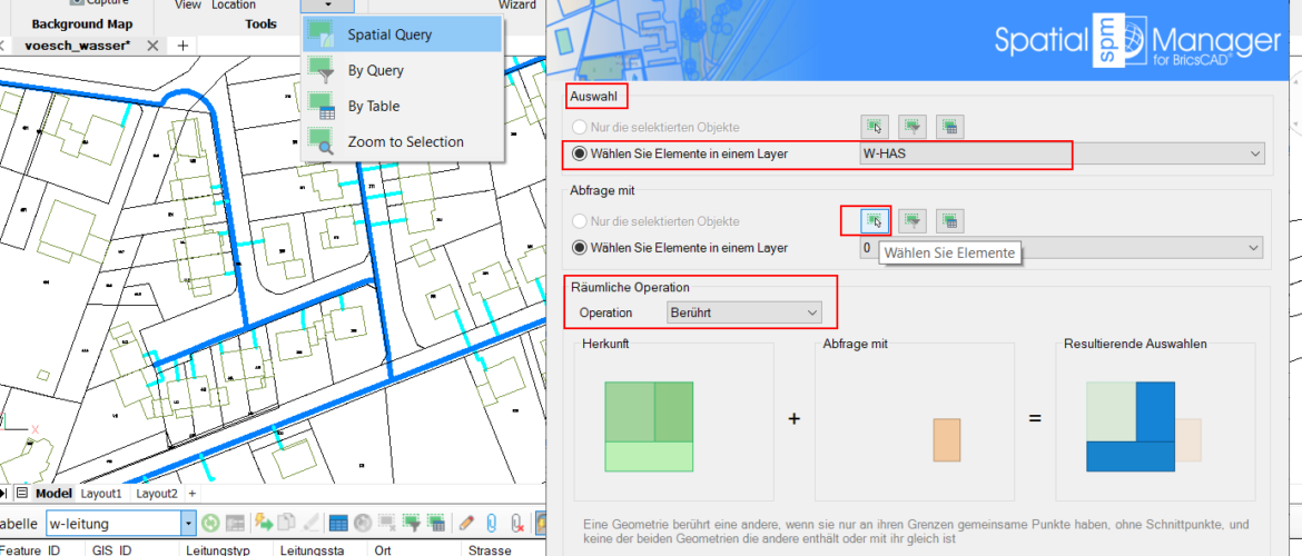 Die erste Aufgabe besteht darin, alle Hausanschlüssen zu finden, welche mit einem Hauptleitungsabschnitt verbunden sind. Zu diesem Zweck öffnen Sie den Dialog Spatial Query. Zu finden unter (Spatial Manager)Tools -> Selection -> Spatial Query.